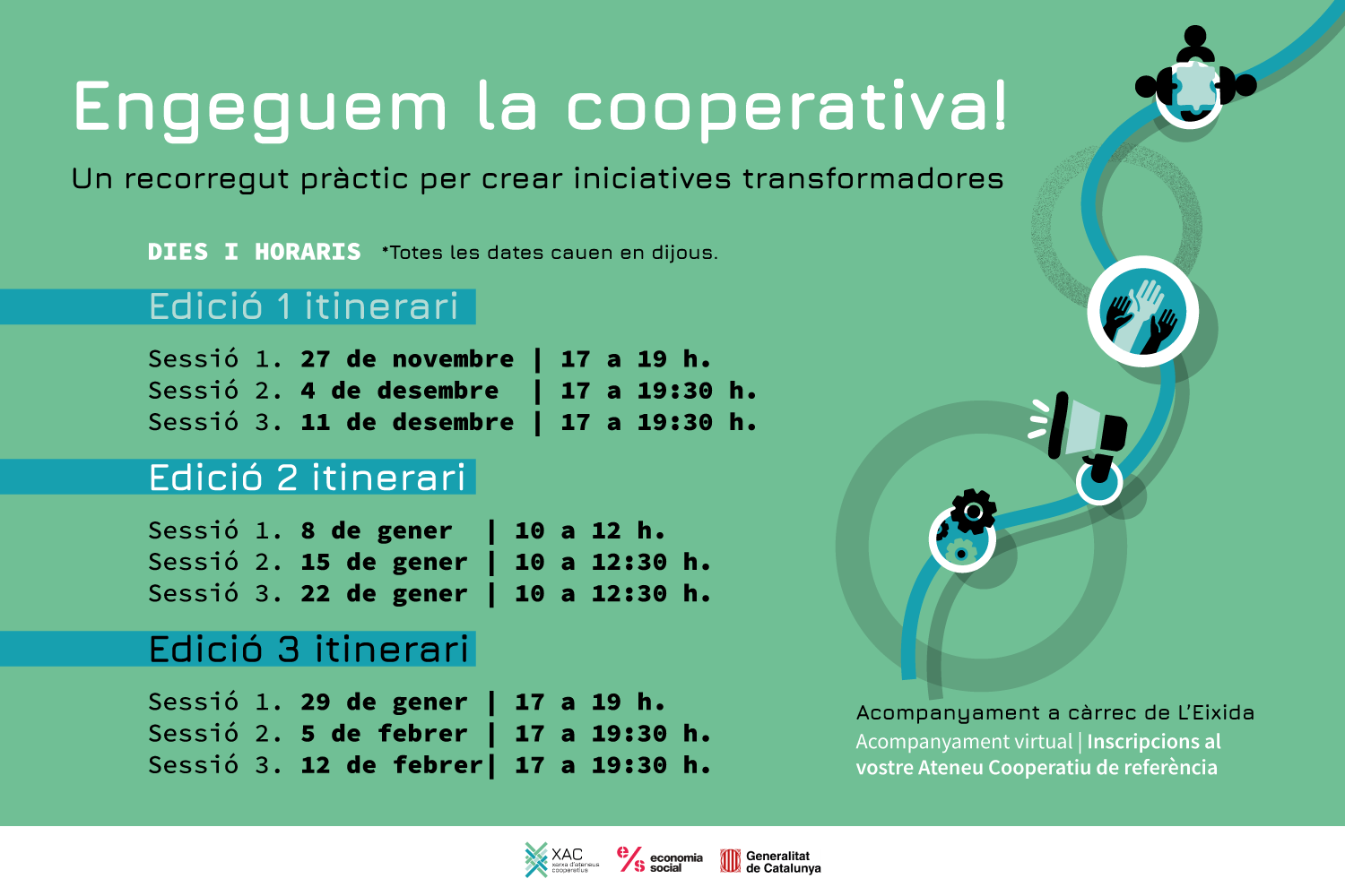 Itinerari formatiu de 3 sessions organitzat per la Xarxa d’Ateneus Cooperatius i impartit per L'Eixida que té per objectiu motivar les persones participants a tirar endavant projectes cooperatius des d’una perspectiva transformadora, coneixent eines de l’ESS en clau jurídica, de finançament, d’articulació i enxarxament; descobrint altres projectes; i incorporant una perspectiva feminista, antiracista i ecològica en la proposta de negoci.